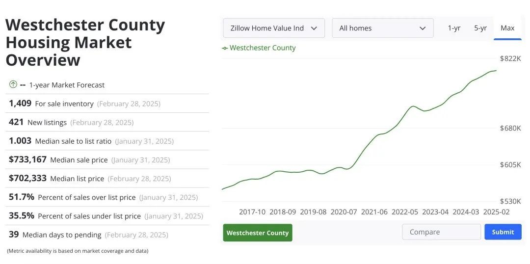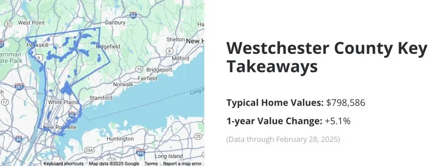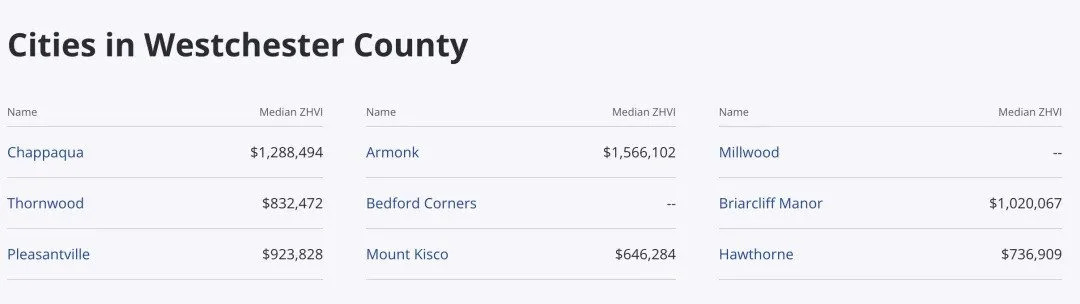 根据Zillow最新数据显示,截至2025年2月,Westchester County的平均房屋估值已达到约79.8万美元,过去一年上涨了5.1%。其中热门镇如Chappaqua、Armonk、Rye和Scarsdale的中位房价均已突破100万美元,部分豪宅区域的挂牌价常常在300万至千万美金不等。