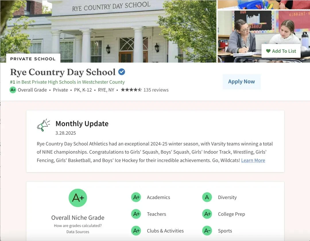 位于Rye镇内的Rye Country Day School在教育平台Niche获得了A+评级。该校以其教学严谨、社区感强、地理位置便捷深受Westchester本地居民喜爱。这所私校历史悠久,每年为名校输送大量优秀毕业生,是本地居住家庭教育规划的稳定优选。