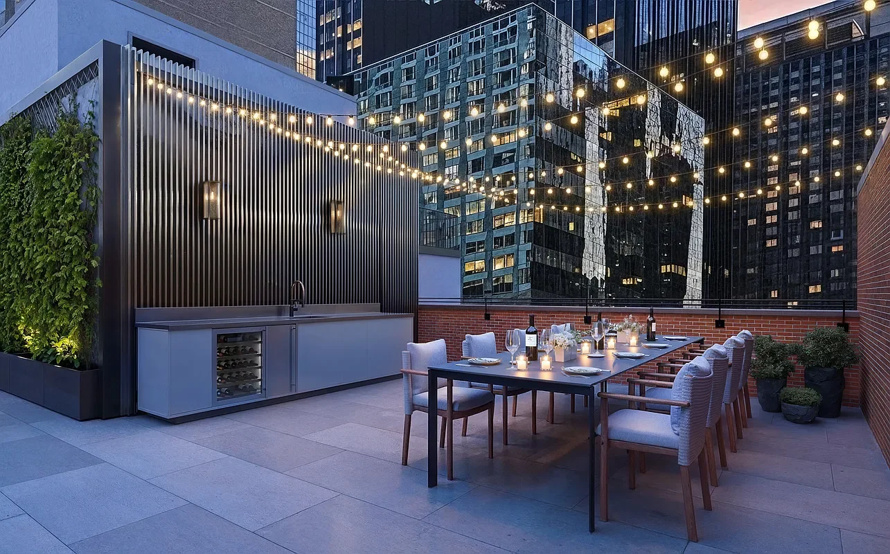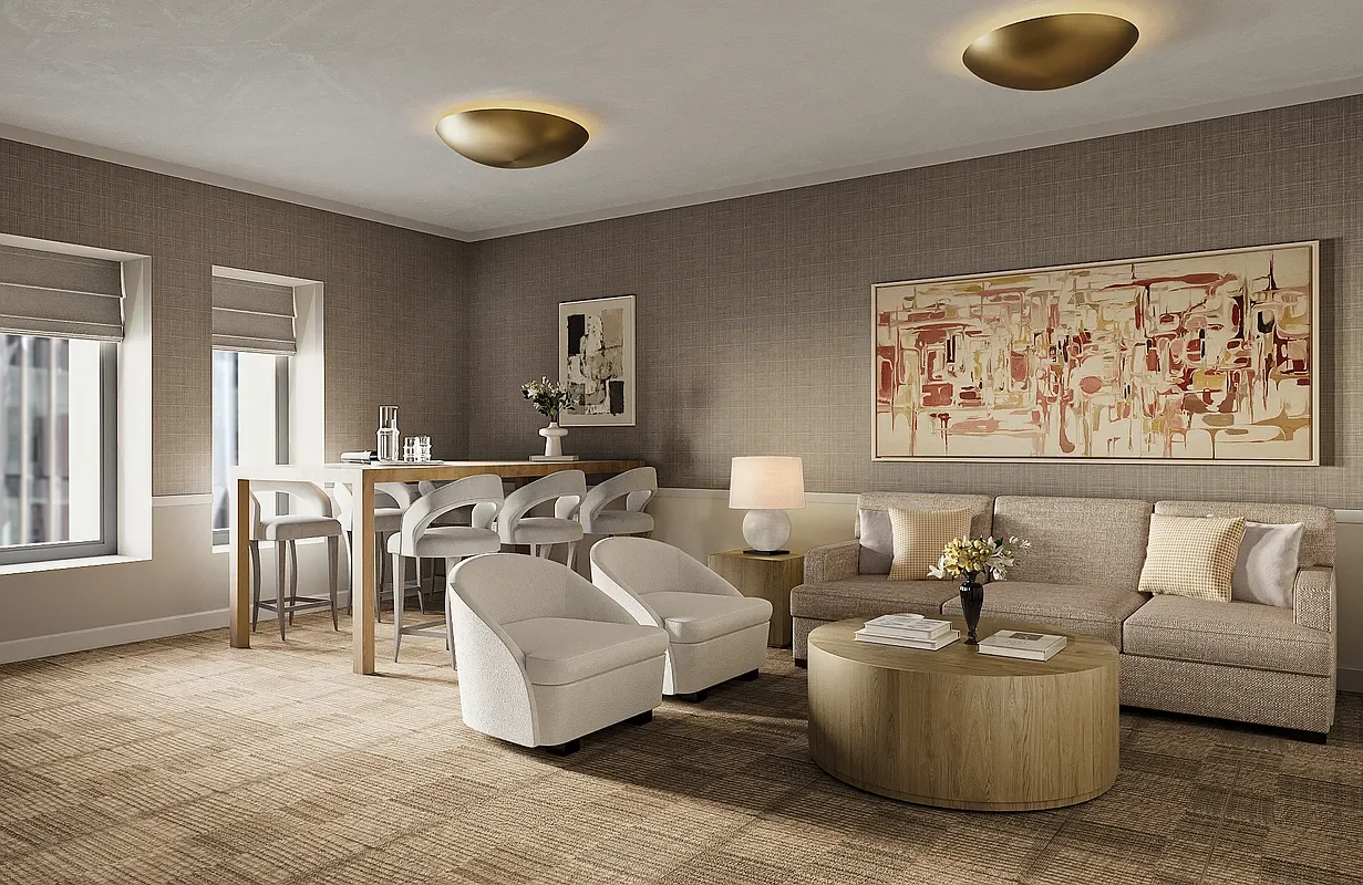 住户休息室延续同样的设计逻辑,大面积自然光与定制家具结合,使其更像一个延伸的生活空间,而不是传统意义上的公共区域。顶层约1600平方英尺的屋顶露台,则提供了城市中难得的户外空间,可以满足社交与休闲的双重需求。此外,大楼还配备储藏空间、自行车存储及包裹管理等基础功能。